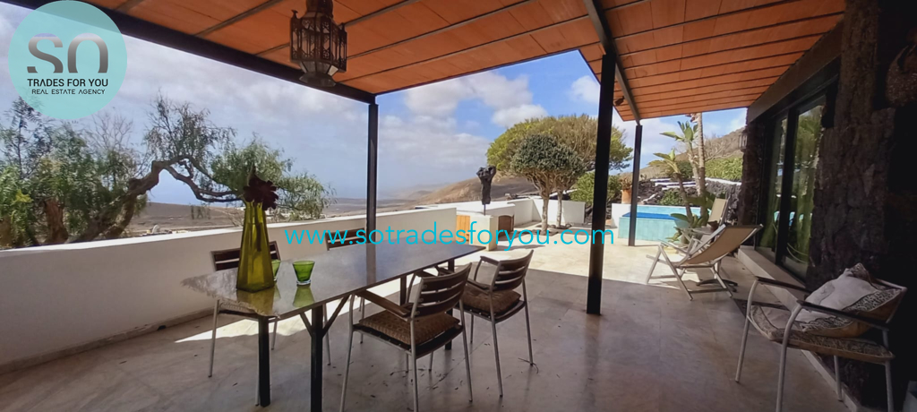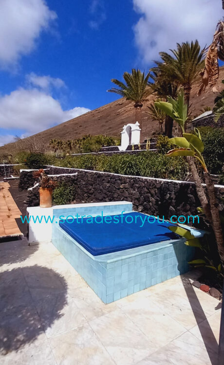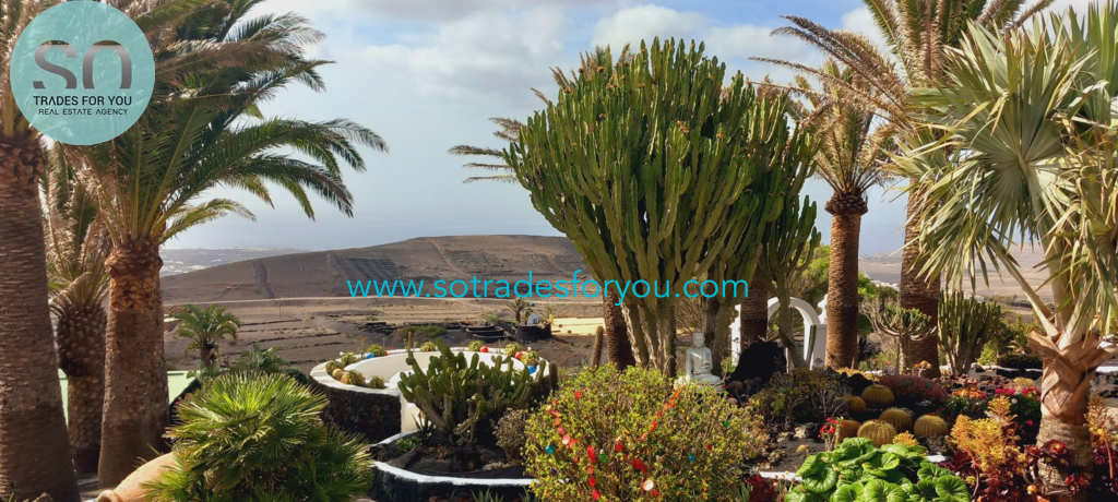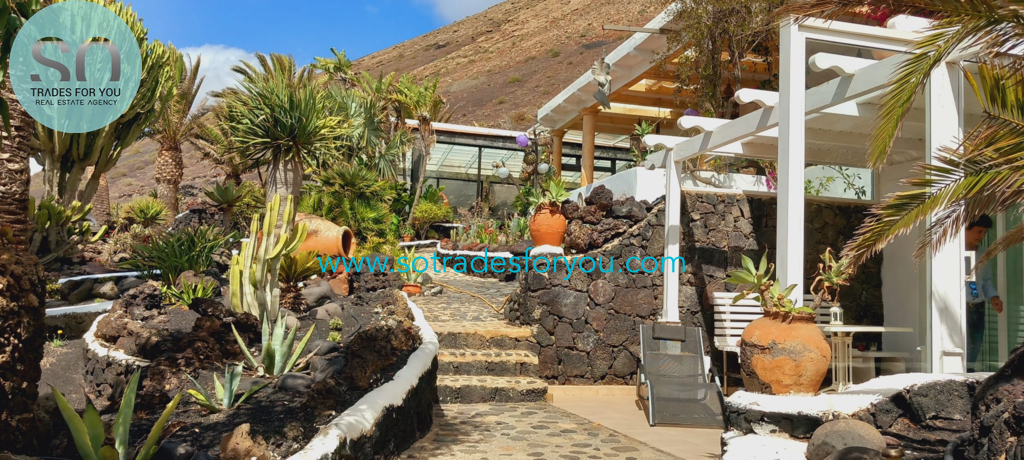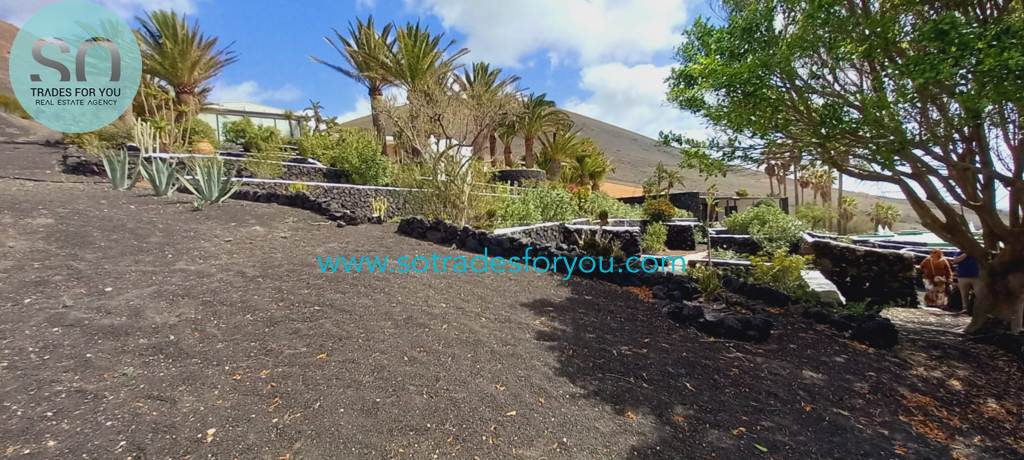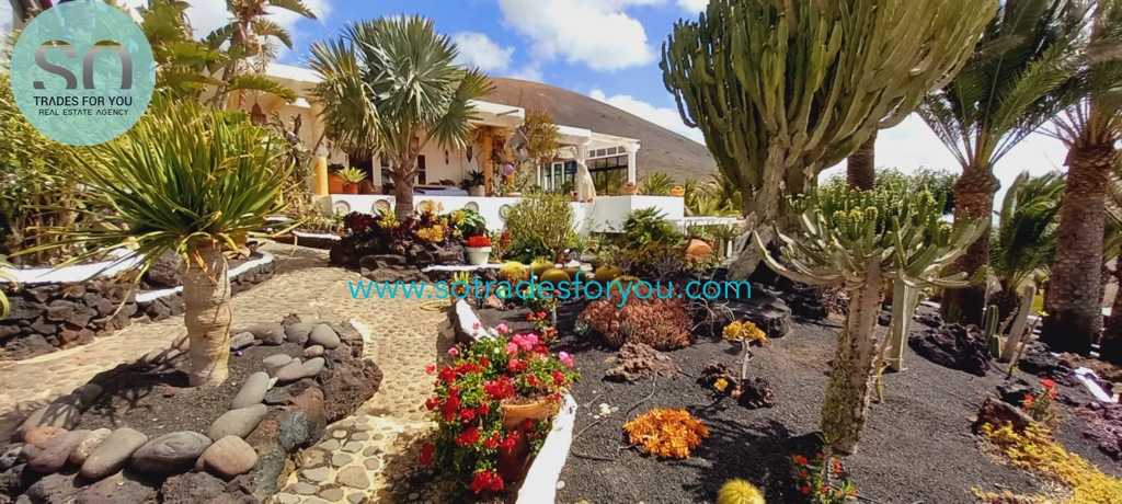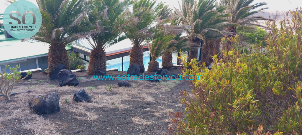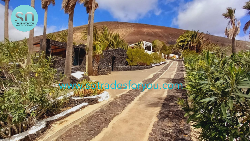 www.sotradesforyou.com offers for sale this impressive and green luxury property in La Asomada, Tías, Lanzarote. This unique property of 750 m2 is located in a privileged location of 40,000 square meters of land, placed on the side of a volcano, surrounded by an oasis of greenery, offering a unique panoramic view that only the natural beauty of the island of Lanzarote can bring you. The real estate part of this property is built on 4 levels, each with a breathtaking view of the ocean and the surrounding area. The main house, of unique elegance, opens onto a large bright patio, leading to a large living/dining room, extended by a large terrace overlooking the green garden with multiple areas of tranquility. You will also find 3 en-suite bedrooms, each including its own dressing room and bathroom. A large kitchen with central island, fully equipped, a wine cellar, a large covered garage for two cars, as well as a heated indoor swimming pool. The numerous interior spaces demonstrate great comfort, offering your